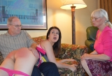 Sarah's Mommy and Daddy found out that she was flashing her bare breasts while on the way to Atlantic City and they were not very happy about it. Sarah was sent to her room while Daddy and Mommy discussed her fate - an OTK bare bottom spanking from each mommy and daddy. After Sarah is spanked on her bare bottom by each mom and dad, she is sent to her room to wait for more punishment. Daddy and Mommy come in carrying a belt and wooden hairbrush. Sarah is given a bare bottom strapping from Daddy with his belt and Momma Dana finishes off her punishment with a hard bare bottom hairbrush spanking.