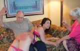 | Sarah is way past her curfew on prom night and Daddy and Momma are worried to death that she got into an accident or worse. Finally their naughty prom princess flounces in the door looking all cute and innocent but Daddy and Momma are not buying her lame excuses. Over Momma's knee she goes but when she pulls up her dress to spank her bottom, Momma discovers she is not wearing panties. Now she is in big trouble and a hard spanking is in order. Daddy puts her over his knee too, before they kneel her on the sofa to spank her simultaneously. Her punishment is finished after daddy takes his belt to her. | |||